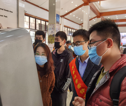 在茶莊游客服務中心的人臉識別通道處,景區(qū)志愿者們正在指導游客有序高效通行,及時購票,避免擁堵。